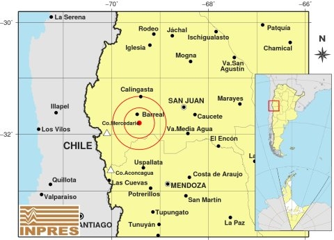 El epicentro del sismo se ubicó a 86 kilómetros al Oeste de San Juan y 21 kilómetros al sudeste de Barreal. El temblor se sintió con una Intensidad de IV a V en Barreal y de III a IV en la Capital.