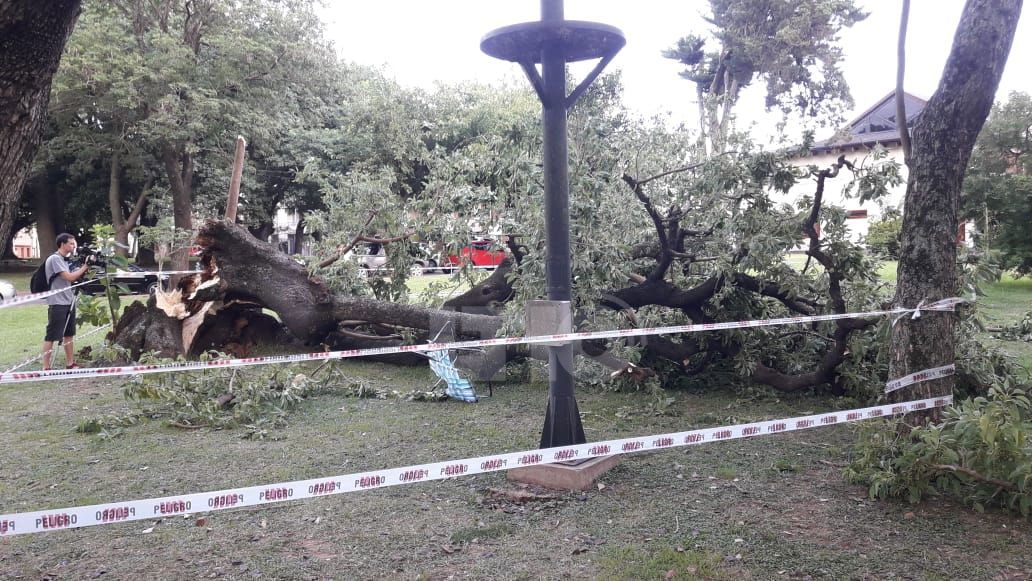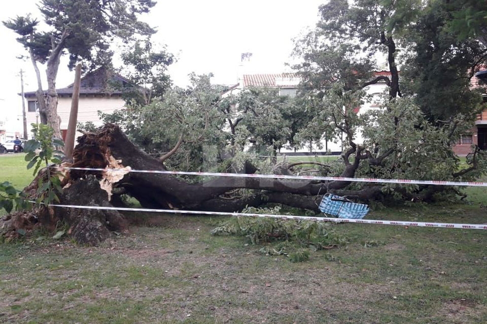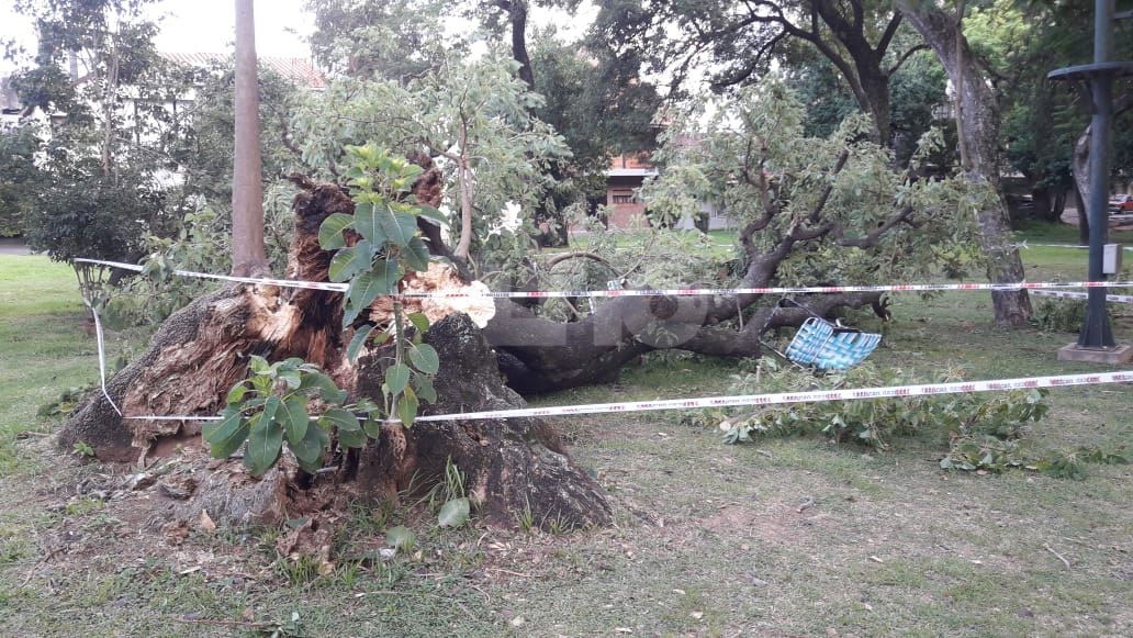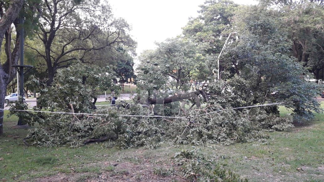 Cuatro personas resultaron heridas tras ser aplastadas por un árbol que cayó en el Parque del Sur. El hecho ocurrió este martes alrededor de las 20hs en inmediaciones de Avenida Arturo Illia y 9 de Julio, donde se desplomó un añoso árbol de considerables dimensiones.