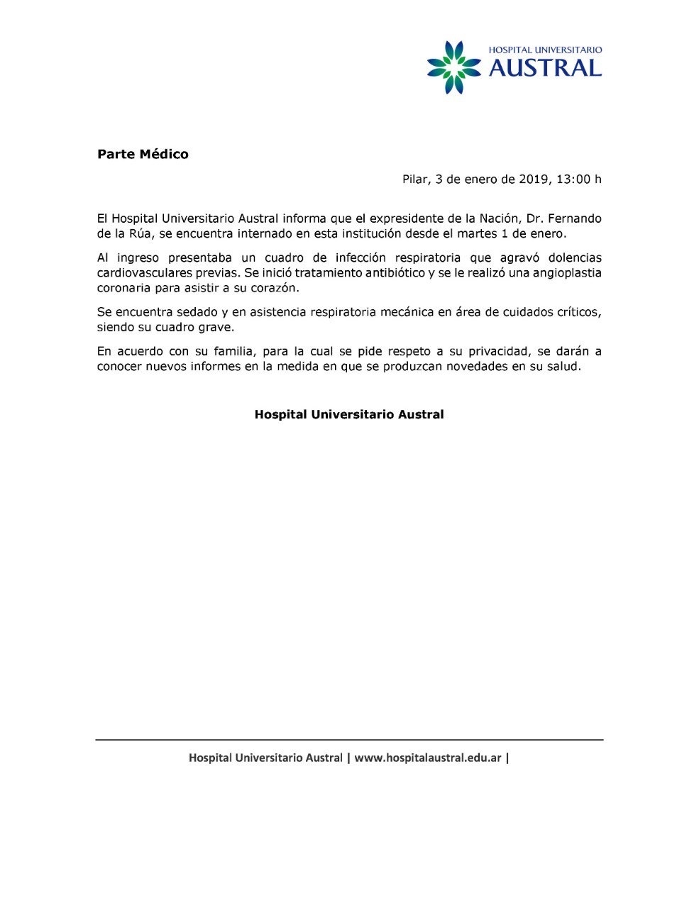 Según el último parte médico difundido por el Hospital Austral,  "se inició tratamiento con antibióticos y se le realizó una angioplastia coronaria". El informe indica además que "se encuentra sedado en asistencia respiratoria mecánica" y su estado sigue siendo grave.