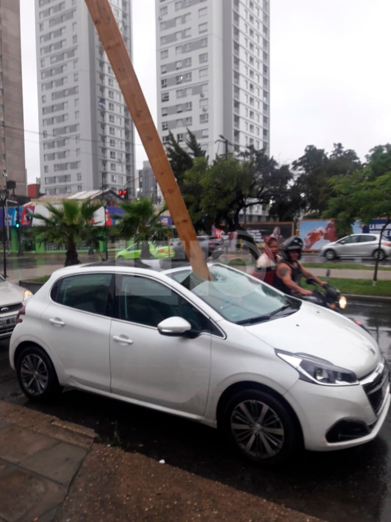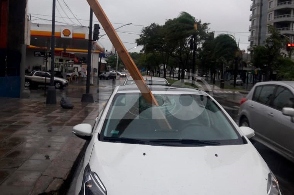 Una viga cayó de la obra en construcción de Iapos y atravesó un auto que circulaba por Rivadavia, a metros de Obispo Gelabert. Sucedió esta tarde a las 18.30 horas.