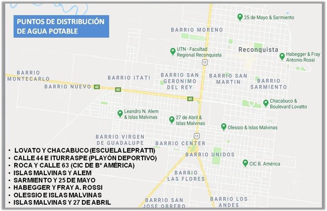 La empresa dispuso un operativo de abastecimiento de emergencia a través de cubas disponibles para que la gente se abastezca. Están situadas en los siguientes puntos fijos de la ciudad de Reconquista:
