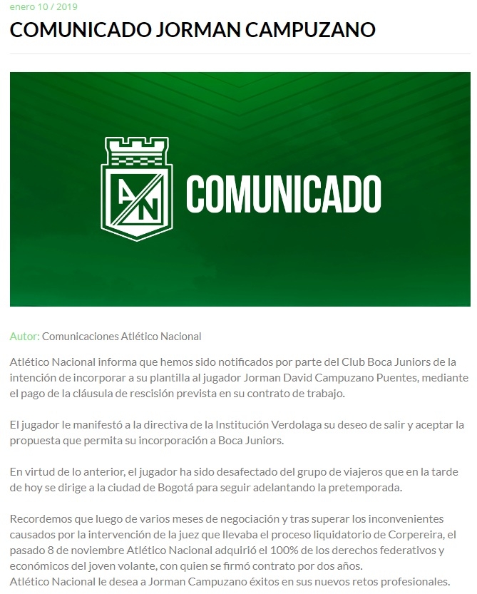 Atlético Nacional de Medellín, en un comunicado difundido esta tarde en su cuenta de Twitter, da como concretado el pase del volante Jorman Campuzano a Boca, por el valor de su cláusula de rescisión que es de 4 millones de dólares.