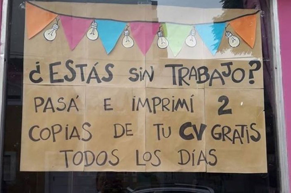 Tal como lo informó el portal Rosario 3, un cartel en la vidriera del local comercial anuncia: “¿Estás sin trabajo? Pasá e imprimí dos copias de tu CV gratis todos los días”.
