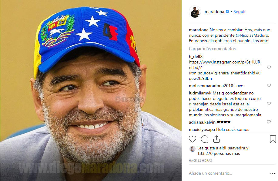 "No voy a cambiar. Hoy, más que nunca, con el presidente @NicolasMaduro. En Venezuela gobierna el pueblo. Los amo!", escribió Maradona en su cuenta de Instagram.