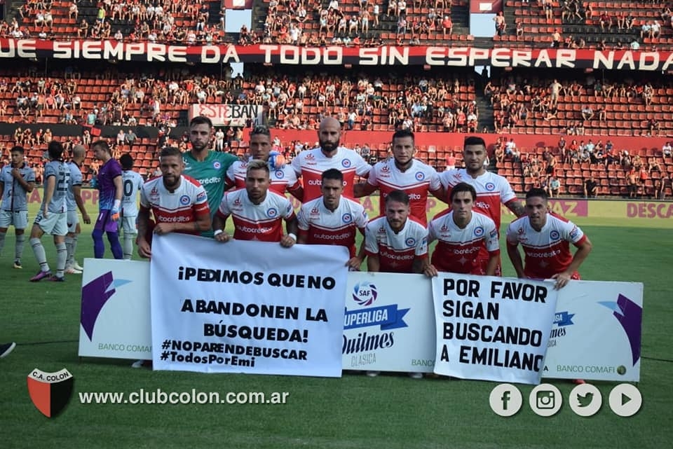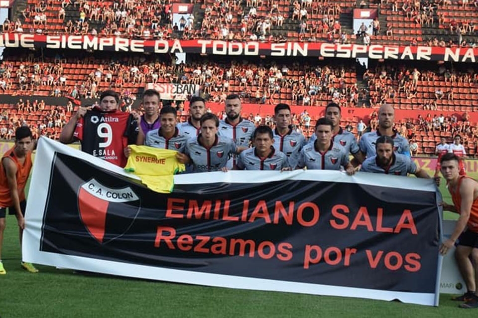 #EmilianoSala Minutos antes del comienzo del partido entre #Colón y #ArgentinosJr, los jugadores sabaleros homenajearon al futbolista santafesino que desapareció en una avioneta en el Canal de la Mancha cuando partía desde Nantes a Cardiff