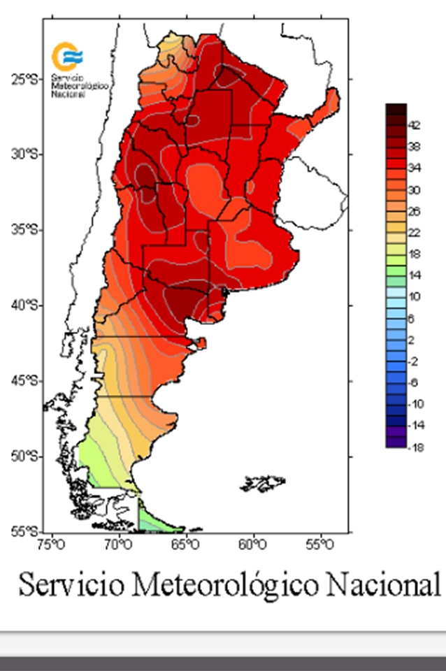 Continúan las altas temperaturas y olas de calor.  El Servicio Meteorológico Nacional  indicaba a las 17 que San Juan y Santiago del Estero eran las provincias más calurosas de la jornada con temperaturas de 39.9º y 39.2º.  Mientras que, ante las olas de calor, la localidad de San Martín, Mendoza estuvo en alerta roja