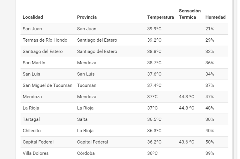 Según datos del Servicio Meteorólogico Nacional a las 17,  San Juan era la ciudad más calurosa del país con 39.9°. Mientras que en la provincia de Santa Fe, Sunchales y Sauce Viejo fueron las ciudades más calurosas donde la temperatura alcanzó los 35.3°.