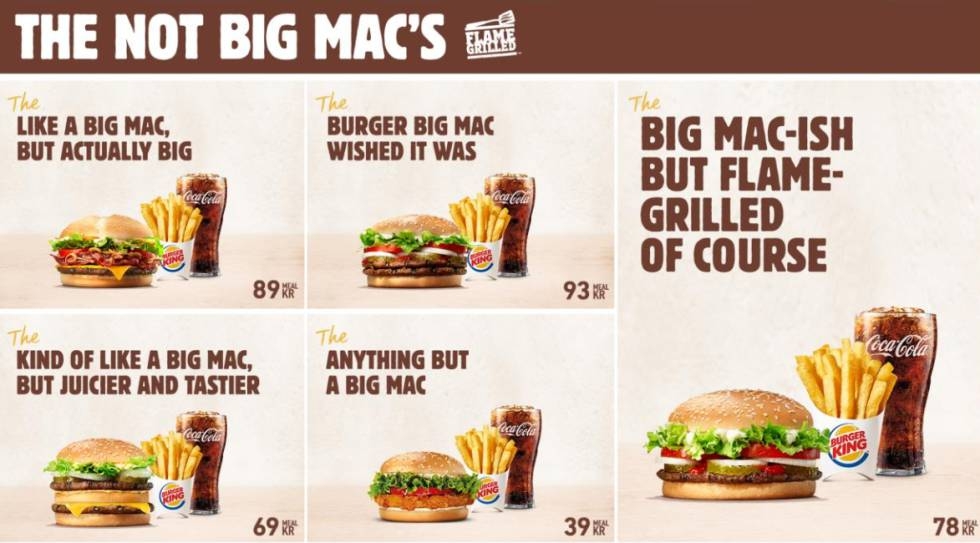 "Como un Big Mac, pero realmente grande"; "La hamburguesa que el Big Mac desearía haber sido"; "Como un Big Mac, pero más jugosa y más sabrosa" y "Cualquier cosa excepto un Big Mac". Estas fueron algunas de las frases que utilizó Burger King en los afiches que empapelaron sus locales de comida rápida en Europa.