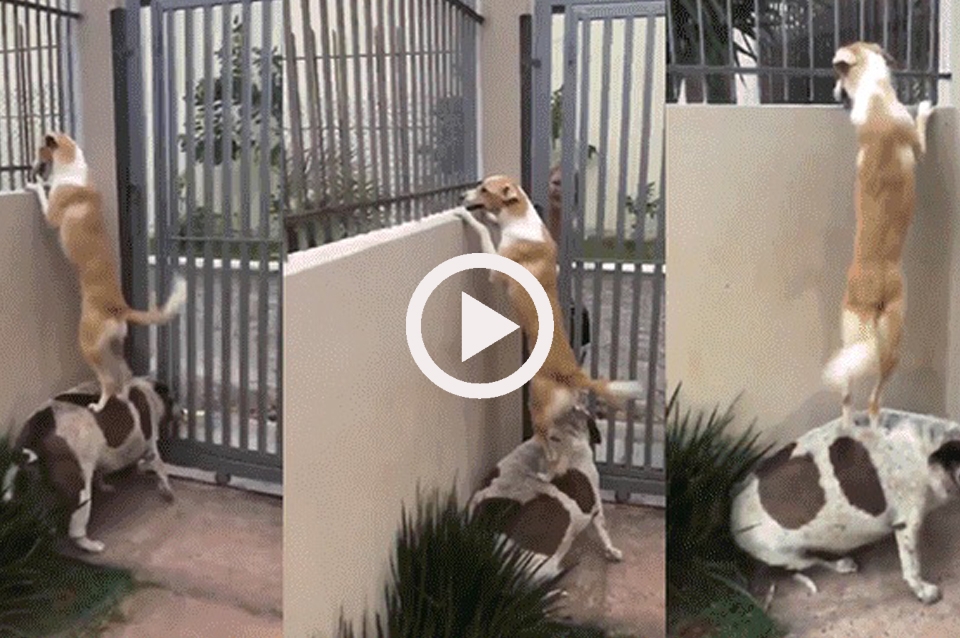 Esto no fue del agrado del perro, quien solo escuchaba los ladridos de su amada, pero no podía verla. Al ver la tristeza de su amigo, un perro con un evidente sobrepeso no dudó en apoyarlo y convertirse en un 'banquito'.