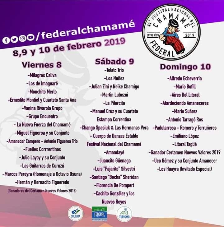 Del 8 al 10 de Febrero se realizará el 44° Festival Nacional del Chamamé, en Federal, Entre Ríos. Se presentarán más de 40 artistas en el escenario.