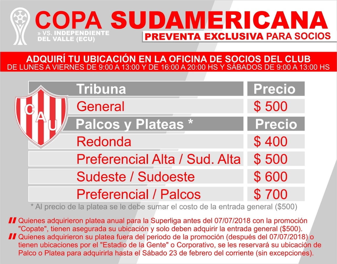 El club Unión lanzó una preventa para los socios tatengues. El encuentro entre el rojiblanco e Independiente de Valle se llevará a cabo el 20 de marzo desde las 21:30 en el 15 de Abril. Para el encuentro los hinchas deberán adquirir su entrada.