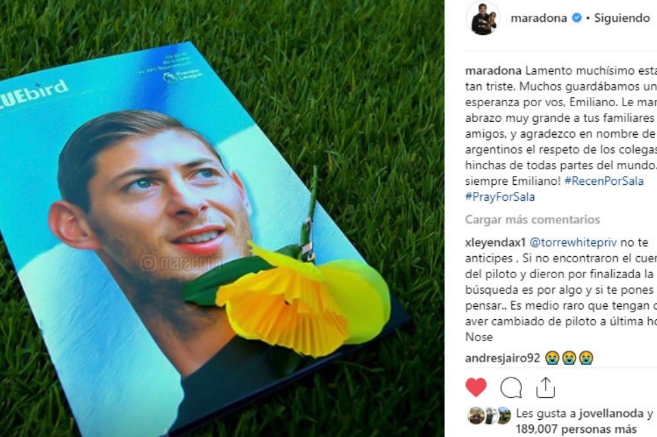 Diego Armando Maradona manifestó hoy su pesar, mediante un comunicado en una red social, por la confirmación de que el cuerpo rescatado del avión que cayó en las aguas del Canal de la Mancha es el del futbolista argentino Emiliano Sala.
