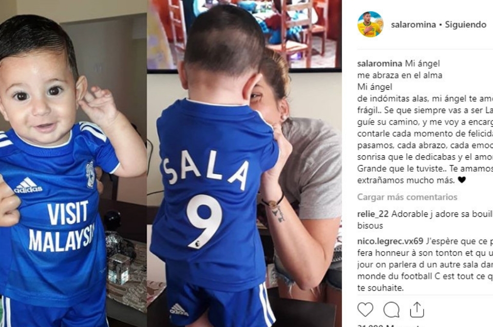 Acompañado de varias imágenes de su hijo con la camiseta de Cardiff, con el número 9 y el apellido Sala en el dorso, Romina escribió: "Mi ángel me abraza en el alma. Mi ángel