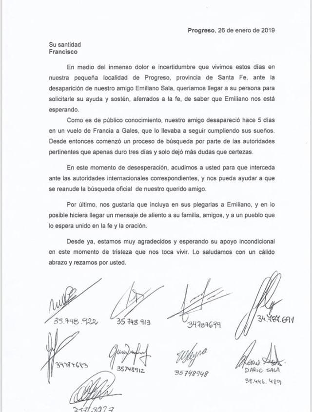 "Nos dirigimos a usted con el mayor de los respetos en este momento de gran dolor por el cual estamos atravsando toda nuestra familia y toda la comunidad de nuestro querido pueblo de Progreso, prov. de Santa Fe, para que interceda ante las autoridades internacionales correspondientes y nos pueda ayudar para que se reanude la búsqueda en el Canal de la Mancha e islas subyacentes de nuestro querido amigo Emiliano Sala.