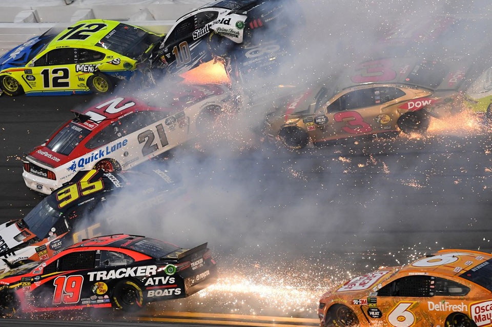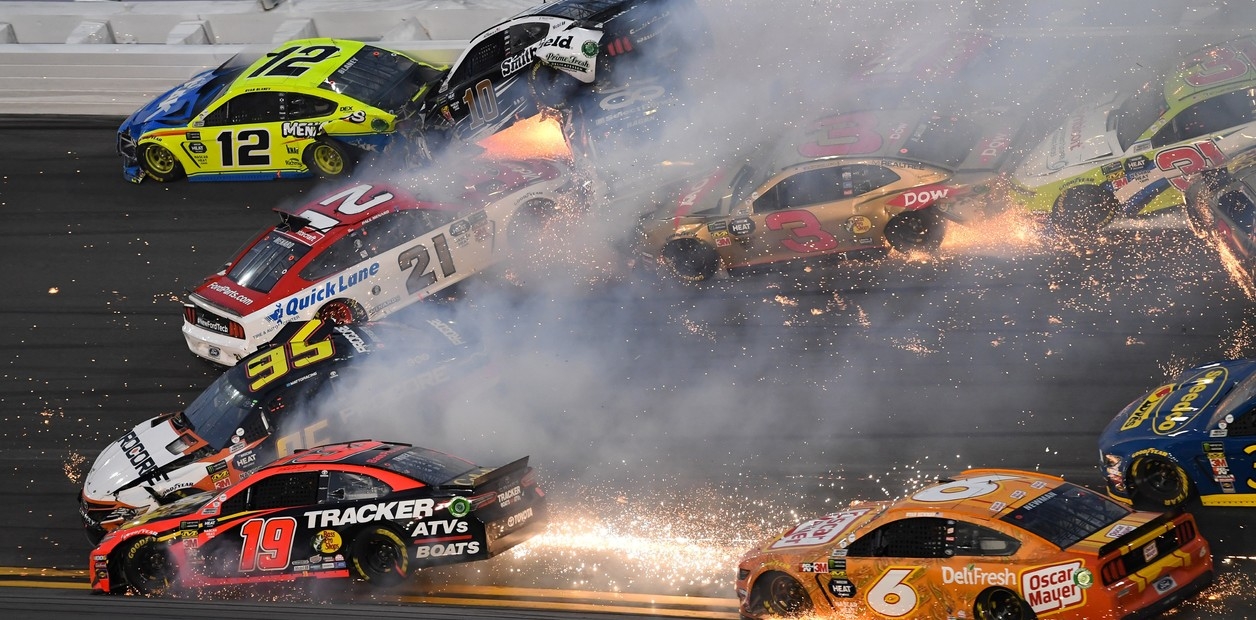 Chispas, llamaradas, humo y trompos. Todo eso ocurrió durante un espectacular choque registrado en las 500 millas de Daytona, correspondiente a la Copa Nascar.