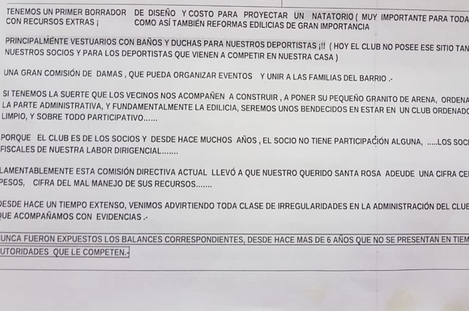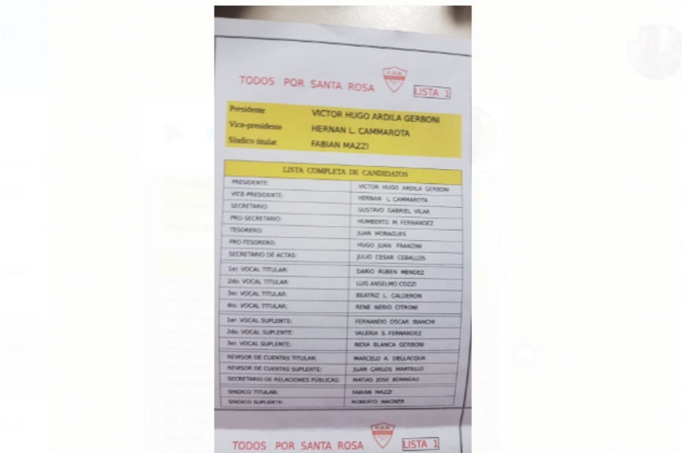 Se presentarán dos listas, una de las cuales es presidida por Víctor Hugo Ardila Gerboni, y tiene como vicepresidente a Hernán Cammarota, y como síndico titular a Fabián Mazzi. La misma es denominada Lista 1, con el lema Todos por Santa Rosa.