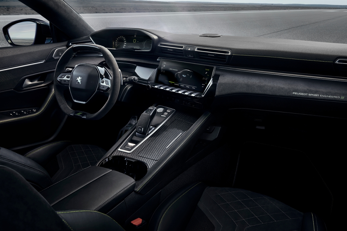 Las manos del conductor se sitúan en un volante con dos zonas planas y forrado en Alcantara® con molduras de fibras de carbono. La parte inferior se completa con una moldura que retoma los 3 rasgos Peugeot Sport Engineered y que incorpora pespuntes que alternan el Kryptonite con el Negro Onyx. Para aportar una nueva experiencia sensorial y visual, la palanca de cambios por impulsos también dispone de una parte realizada en ese tejido.