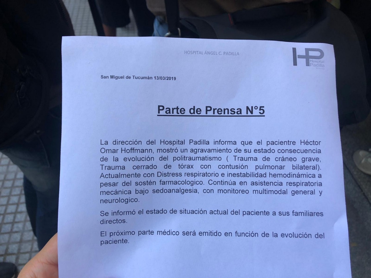 "El paciente Héctor Omar Hoffmann, -Sergio Denis- mostró un agravamiento de su estado (como) consecuencia de la evolución del politraumatismo (trauma de cráneo grave, trauma cerrado de tórax con contusión pulmonar bilateral)", dice el documento, y continúa indicando que el artista padece "distress respiratorio e inestabilidad hemodinámica, a pesar del sostén farmacológico".