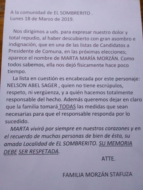 Fueron los propios vecinos de la localidad los que dieron el aviso para que intervenga el Tribunal electoral, en tanto que la familia de la mujer emitió un comunicado que fue difundido por el portal Infonea: “La lista en cuestión es encabezada por este personaje: Nelson Abel Saguer, quien no tiene escrúpulos, respeto, ni vergüenza, y a quién hacemos totalmente responsable del hecho. Además queremos dejar en claro que la familia tomará todas las medidas que sean necesarias para que el responsable responsa por lo sucedido”, explica la carta.