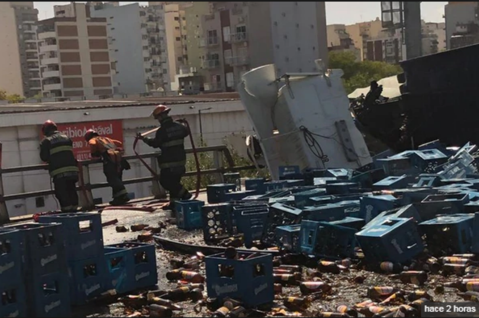 Un camión cayó sobre un estacionamiento de colectivos desde la autopista 25 de Mayo y el chofer tuvo que ser rescatado herido de la cabina, tras chocar con otro que volcó toda su carga de cerveza sobre la autopista 25 de Mayo a la altura del barrio porteño de Boedo.