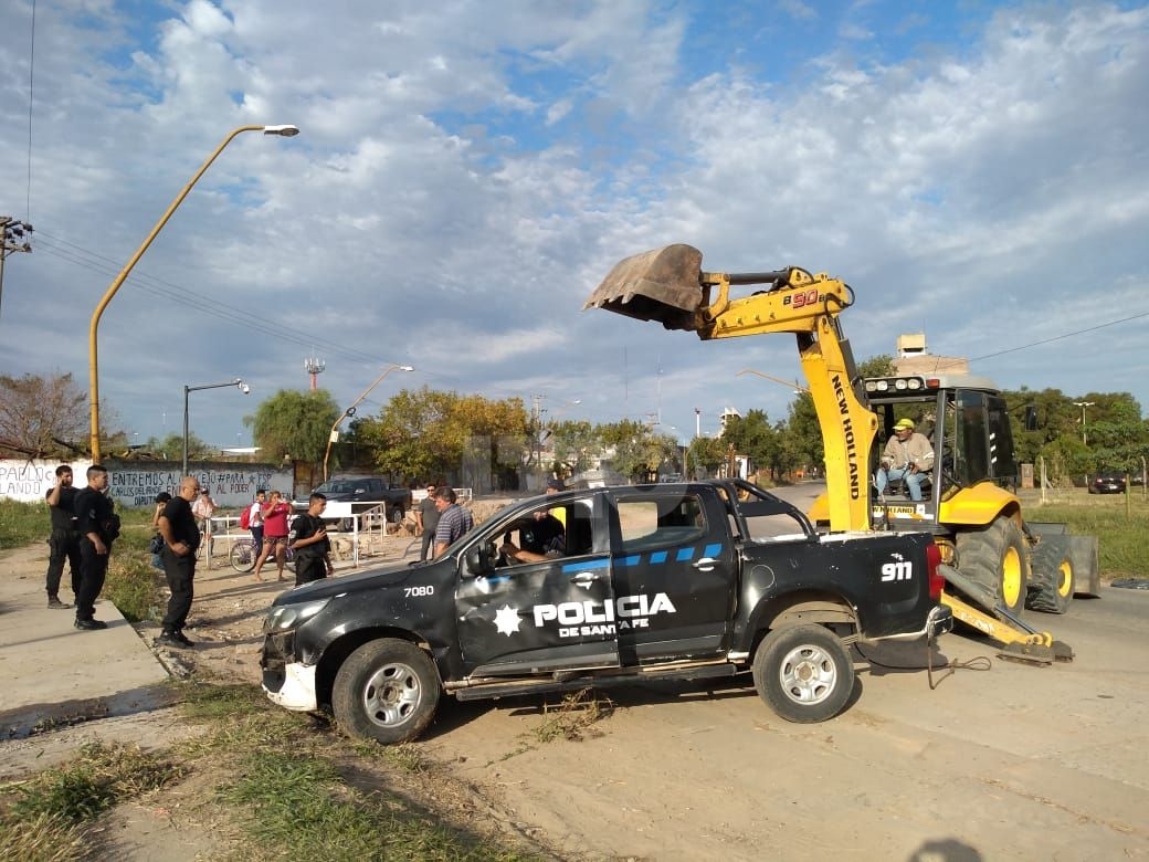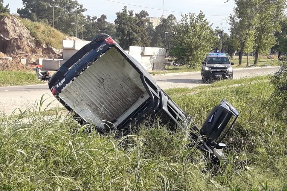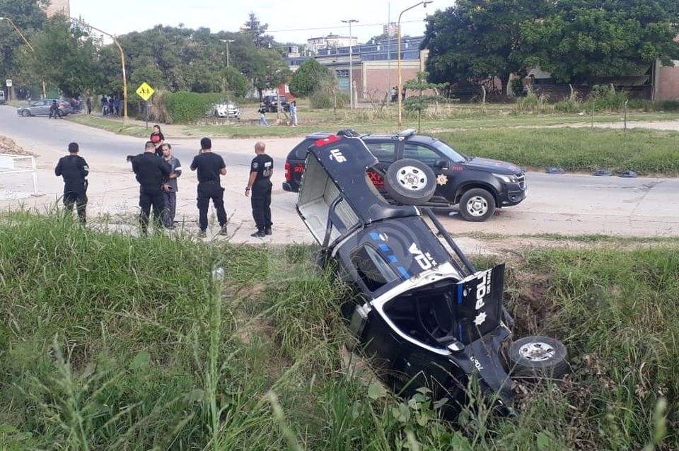 Varios móviles policiales perseguían a un ladrón de bicicletas cuando una de las camionetas perdió el control y terminó en uno de los zanjones que bordea el Parque Garay, puntualmente en Bv. Pellegrini al 3900, en la zona de vías.