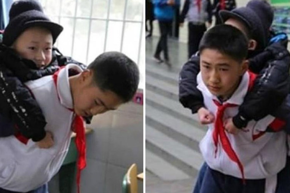 La historia conmovió en las redes sociales. Se trata de Xu Bingyang un niño chino de sólo 12 años que desde hace seis carga con su amigo Zhang Ze, que sufre una discapacidad, cada día para llevarlo a la escuela.