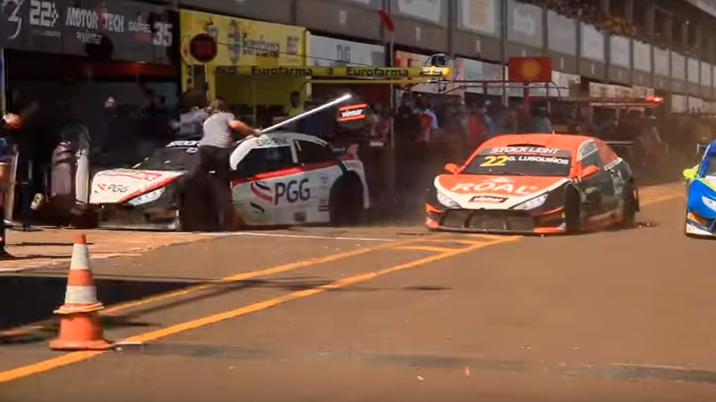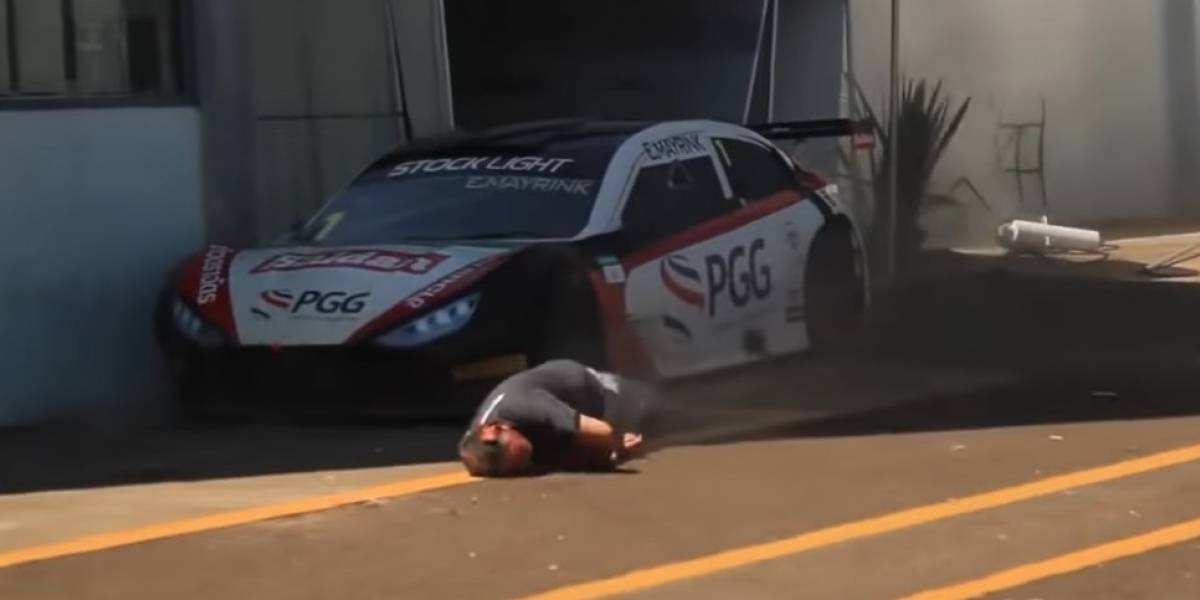 19 de agosto de 2018, Campo Grande, Brasil: una carrera en el Campeonato Brasileño de StockCar Light está en marcha cuando varios conductores se detienen en el pitlane. Un piloto, Erik Mayrink, lo atiende su equipo de mecanicos y luego intenta reincorporarse al pitlane, pero un auto de lo golpea por fuera. El auto de Mayrink luego choca con otro y lo envía hacia un grupo de mecánicos, chocando contra tres de los trabajadores antes de golpear a un cuarto que vuela por el aire tras la colision.