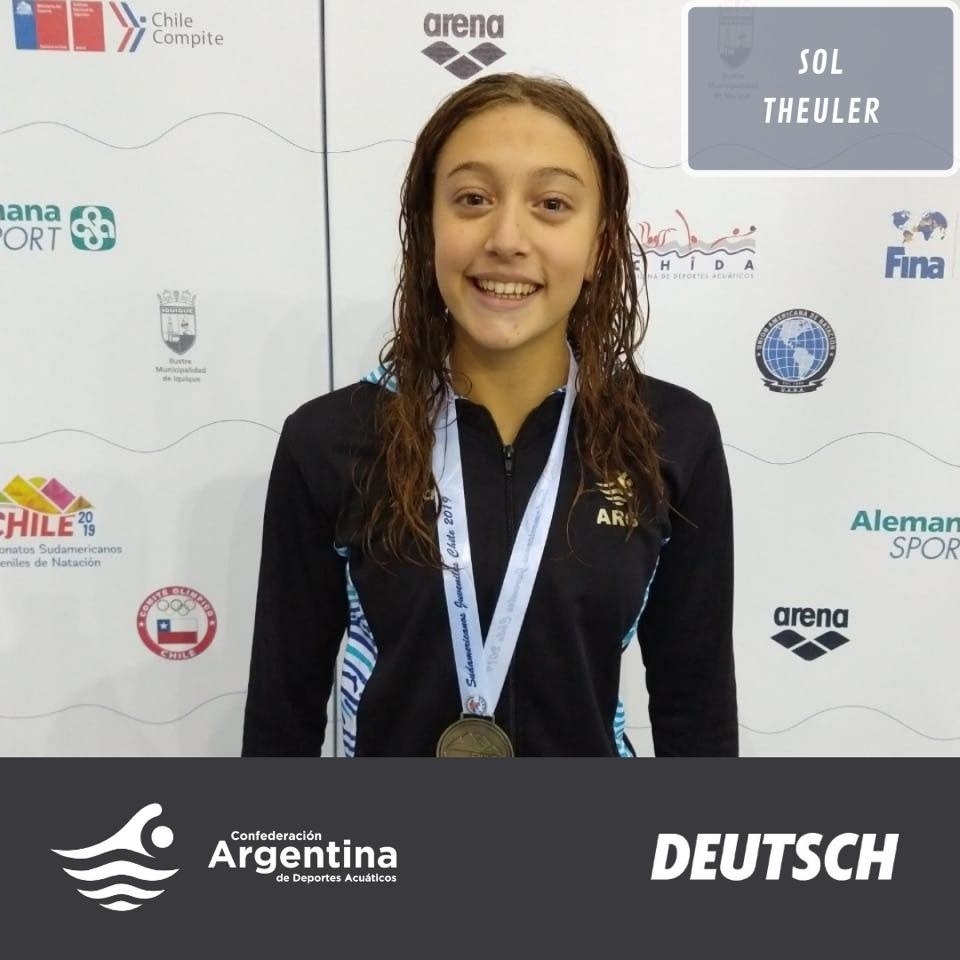 Pero hubo dos talentos que fueron vitales para la cosecha total nacional. Se trata de las santafesinas Sol Theuler (club Regatas) y Candela Giordanino (club Unión), quienes irrumpieron con gran suceso en pileta y aguas abiertas, según consignó el sitio unosantafe. Ambas tiene 15 años categoría cadete 2 en Argentina y juvenil A a nivel sudamericano.