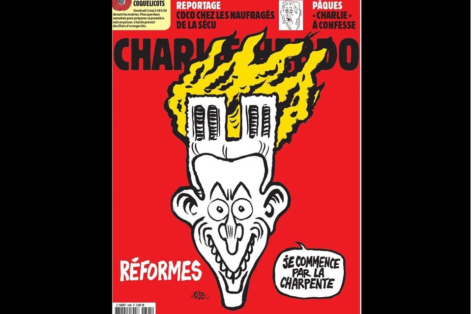 El fondo de la tapa es rojo. El nombre de la revista está en negro, parcialmente tapado por las llamas de las torres de Notre Dame que surgen de la cabeza de Macron. Debajo se lee, en blanco: "Reformas". Y un globo de diálogo incluye una "frase" del presidente francés: "Empiezo por la estructura".