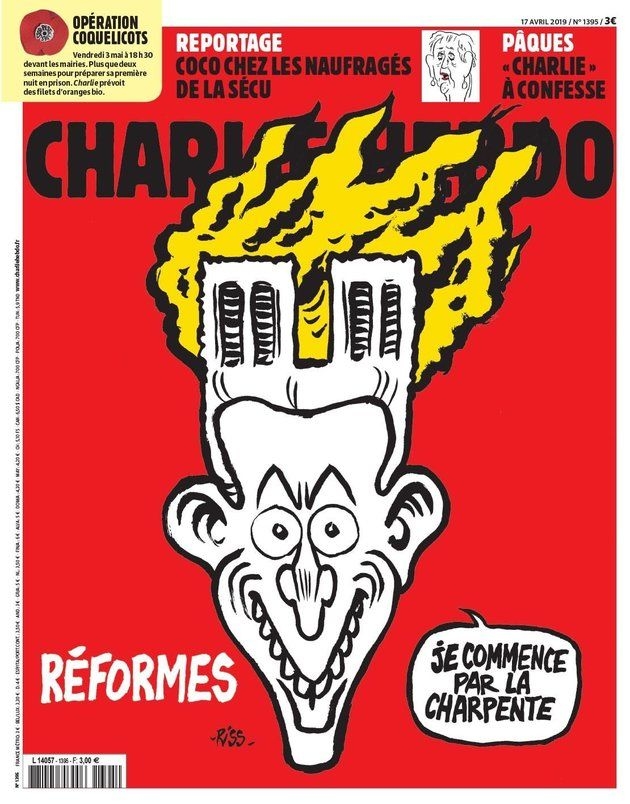 Otra vez la revista francesa Charlie Ebdo, famosa por su discurso agudo, picante y mordaz dirigido a ridiculizar, y que tomó más notoriedad luego del atentado donde se mató a su director, publicó hoy su edición semanal con una tapa dedicada al incendio de la Catedral de Notre Dame de París y al presidente de Francia, Emmanuel Macron . Una caricatura del mandatario y de las emblemáticas torres de Notre Dame en llamas dominan la portada.