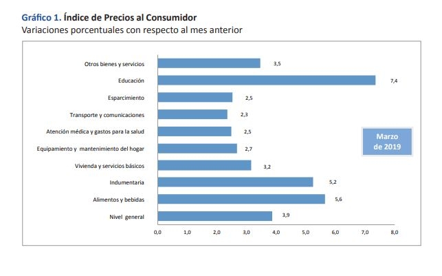 Cabe destacar que en la comparación interanual (de marzo de 2018 a marzo de 2019), el IPC general tuvo un aumento de 55,8%; y Alimentos y Bebidas, una suba de 59,9%.