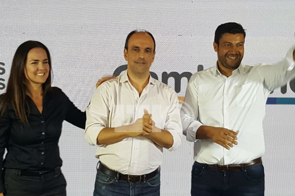 Desde el búnker de Cambiemos, ubicado en el hotel Río Grande, el candidato a gobernador José Corral, acompañado de su compañera de fórmula, Anita Martínez, agradeció el apoyo electoral de "cientos de miles de santafesinos".