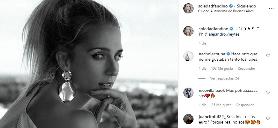 "Lunes", escribió Fandiño al pie de una bella imagen, en blanco y negro. Y Nacho le contestó: "Hace rato que no me gustaban tanto los lunes". Al ver el piropo 2.0, Soledad le respondió con tres corazones.