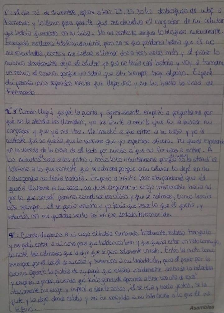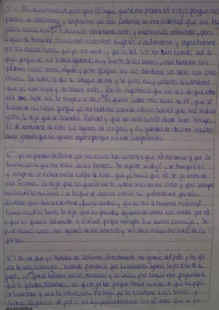 “Cuando llegué, golpeé la puerta y agresivamente comenzó a preguntarme por qué no le atendía las llamadas", relató la joven, que además aseguró que la víctima no dejaba de insultarla a los gritos y que, para no empeorar las cosas, accedió a que la llevara a su casa. “Él se ponía violento y yo tenía que hacer lo que él quería. Y además no me gustaba verlo así en ese estado irreconocible”.