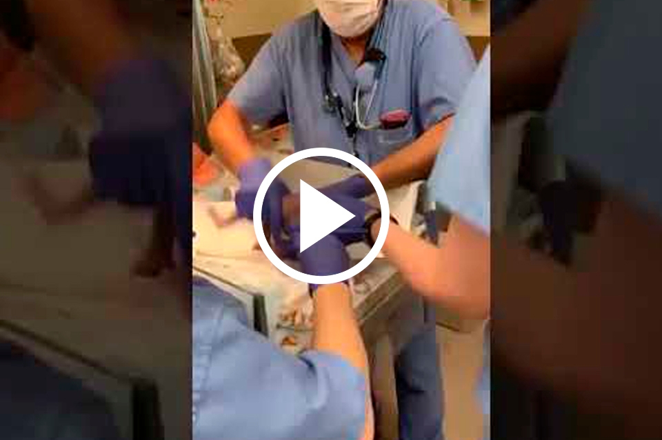 En las imágenes se puede ver que el médico tiene a la bebé cuando la enfermera retira las sábanas, "engancha" las que envolvían a la recién nacida y se le cae de las manos al doctor. Luego del hecho, siguen el procedimiento de rutina como si el golpe no hubiera sucedido.