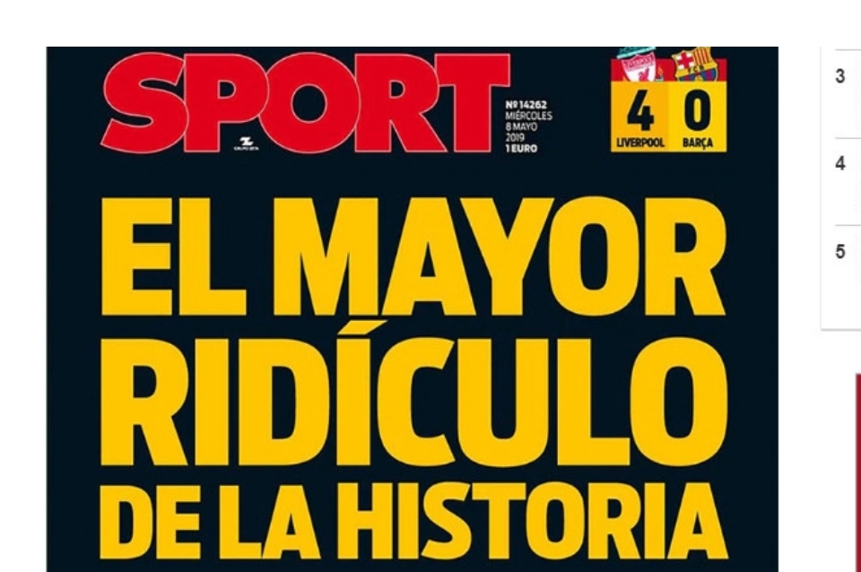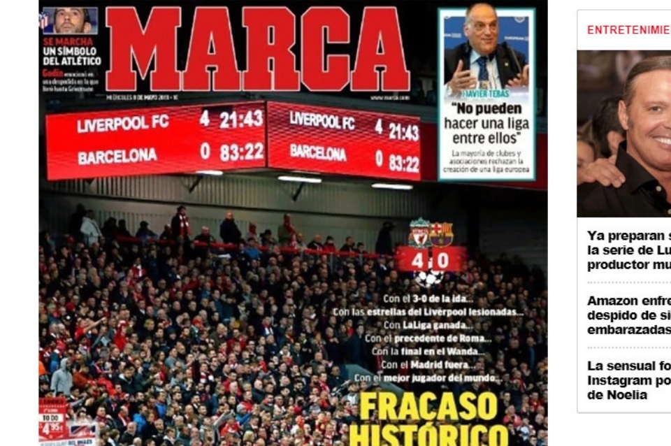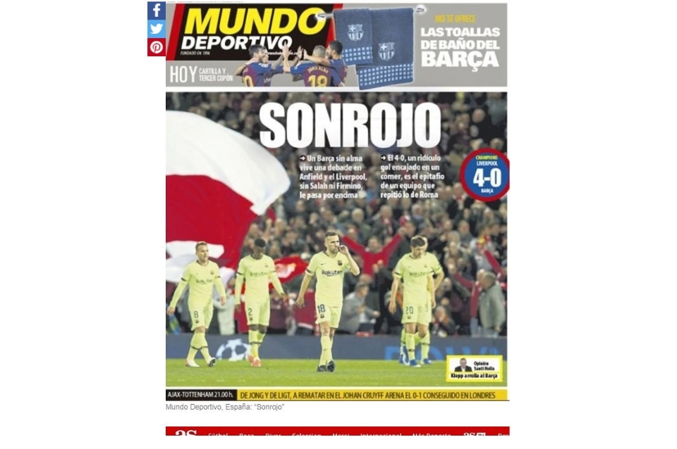 "Un Barça sin alma vive una debacle en Anfield", escribe el rotativo en primera página. "El 4-0, un ridículo gol encajado en un córner, es el epitafio de un equipo que repitió lo de Roma" un año antes en cuartos de final (4-1, 0-3), añade Mundo Deportivo. En la capital española, los diarios más cercanos al Real Madrid, parecen más sorprendidos que divertidos, señal de una derrota que nadie veía venir.