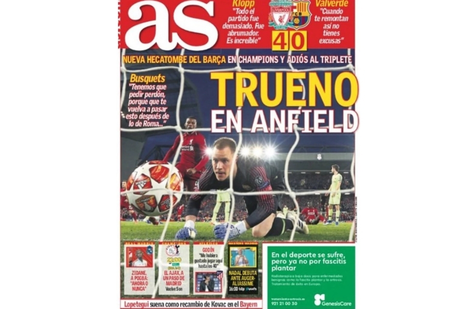 "Trueno en Anfield", titula el rotativo AS, con esta mención: "Nueva hecatombe del Barça en Champions y adiós al triplete", este encadenamiento Liga-Copa-Champions, que el Barcelona esperaba repetir como en 2009 y 2015.