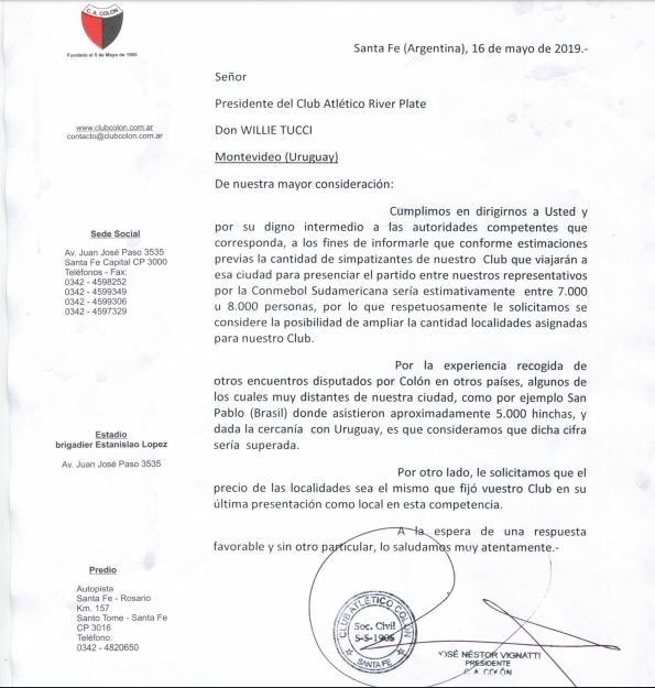 En estos momentos el presidente José Vigantti se encuentra abocado a negociar con el mandamás de River Plate de Montevideo, Willie Tucci, para que la parcialidad sabalera que viaje a Uruguay a ver a Colón tenga más entradas a disposición. El partido se jugará el 21 de mayo a las 19.15 por la segunda fase de la Copa Sudamericana.