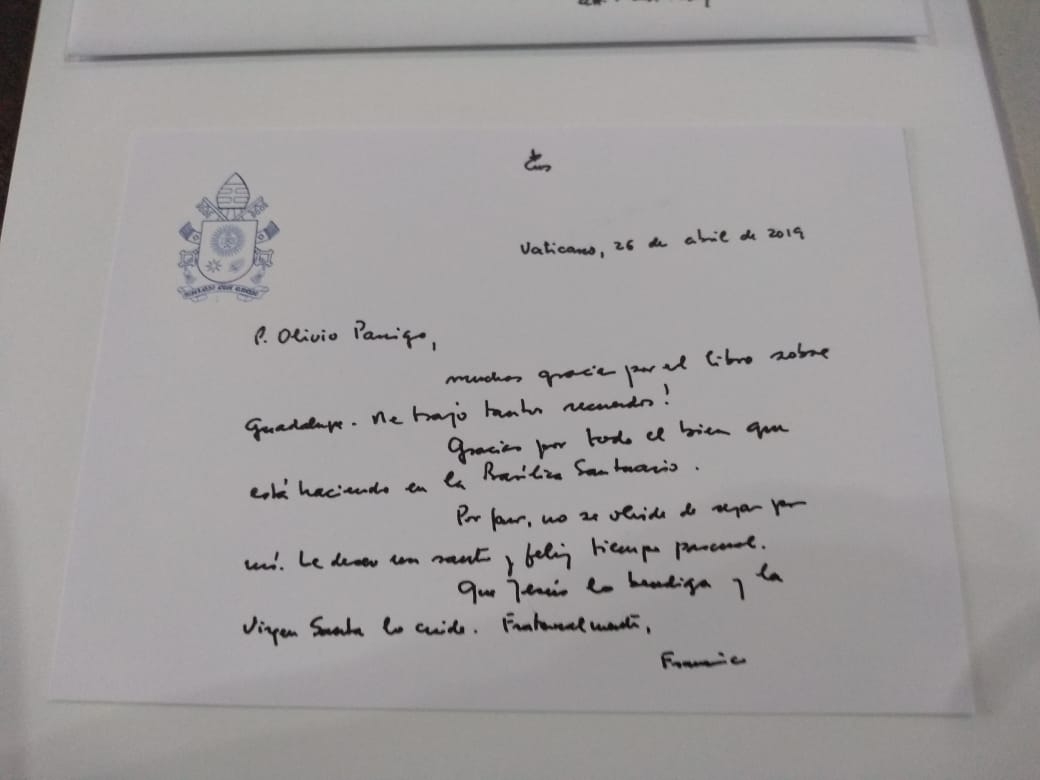 Francisco destacó que el libro le trajo "muchos recuerdos", y agregó: "Gracias por todo el bien que está haciendo en la Basílica Santuario”.