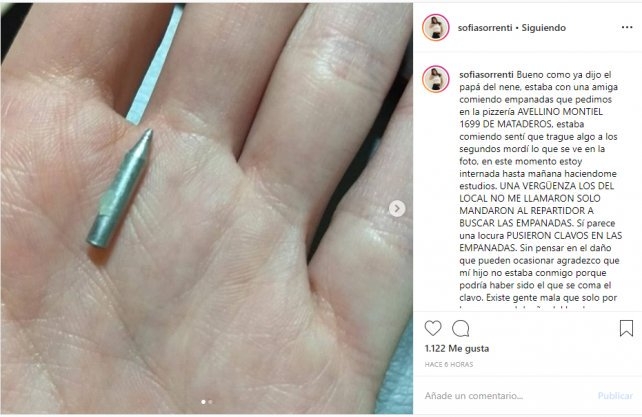 Y agregó: "UNA VERGÜENZA LOS DEL LOCAL NO ME LLAMARON SOLO MANDARON AL REPARTIDOR A BUSCAR LAS EMPANADAS. Sí parece una locura PUSIERON CLAVOS EN LAS EMPANADAS. Sin pensar en el daño que pueden ocasionar agradezco que mí hijo no estaba conmigo porque podría haber sido el que se coma el clavo. Existe gente mala que solo por bronca con el dueño del local se caga en la gente".