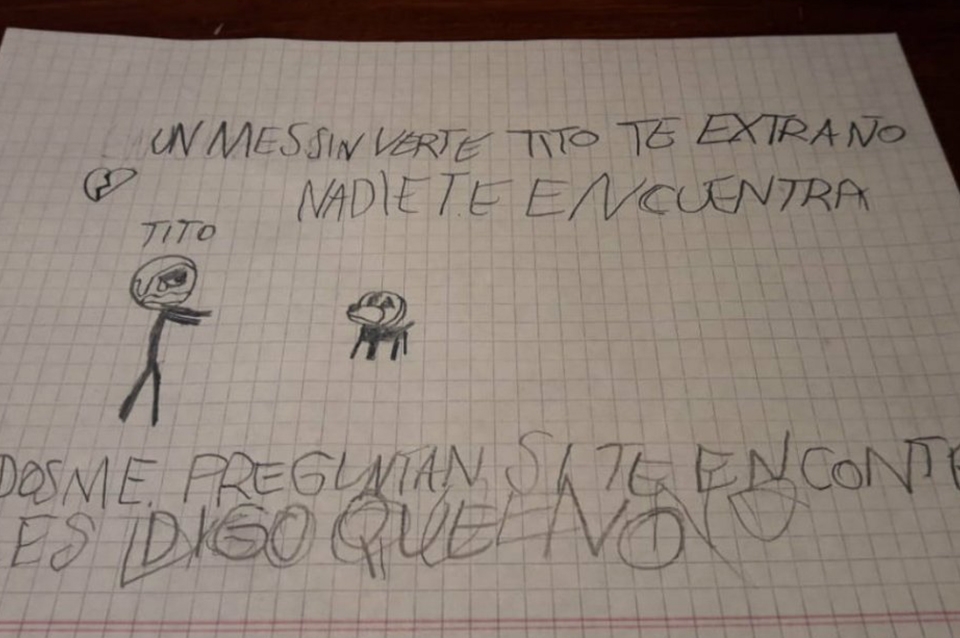 "Un mes sin verte, Tito, te extraño. Nadie te encuentra. Todos me preguntan si te encontré y les digo que no", escribió descorazonado Leo, de 11 años, en un dibujo donde se lo ve con su pequeño perro.