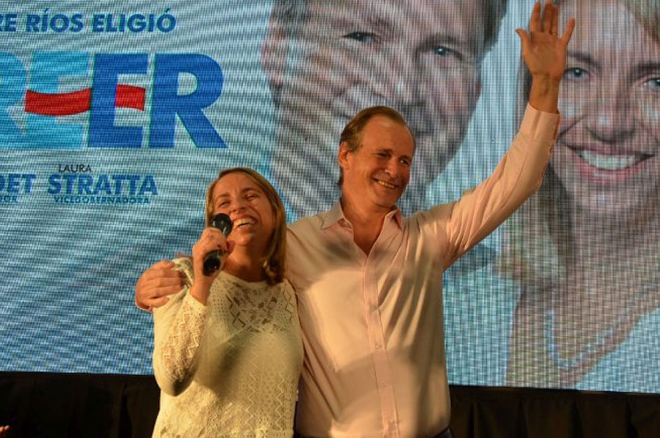 Minutos antes de las 21:30, Bordet salió a celebrar el triunfo con sus militantes en el búnker, junto a su compañera de fórmula y vicegobernadora electa, Laura Stratta.