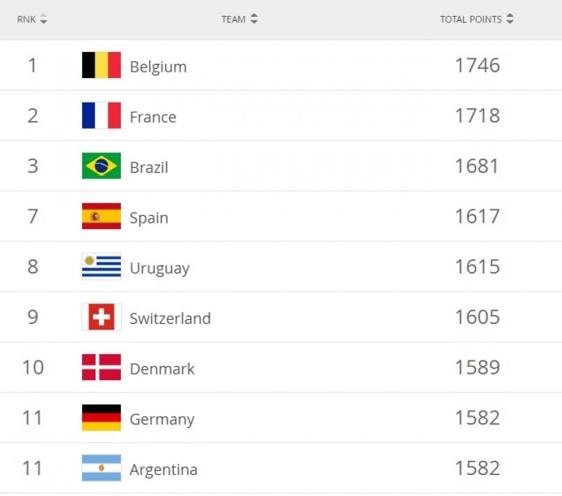 El primer lugar sigue en manos de Bélgica (1746 unidades), mientras que el campeón del mundo Francia aparece como escolta (1718). Portugal, por su parte, logró meterse entre los cinco de arriba con su consagración en la UEFA Nations League.