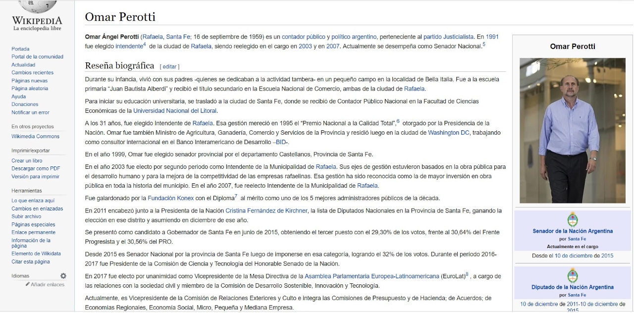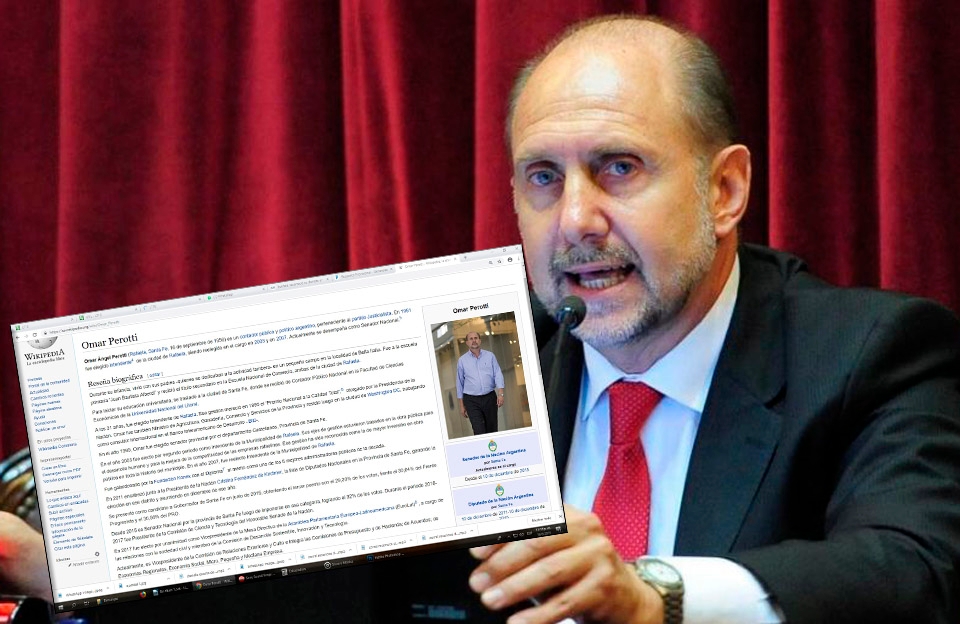 Una de las curiosidades de estas elecciones se dio en internet. A una hora del cierre del escrutinio, el gigante Wikipedia ya daba como ganador a Omar Perotti y lo anunciaba en la página personal del rafaelino en el último párrafo.