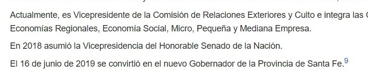 En la descripción personal muestra todos los cargos que ejerció publicamente y, antes de cerrar la página se incorporó la frase que indica que "el 16 de junio de 2019 se convirtió en el nuevo Gobernador de la Provincia de Santa Fe".
