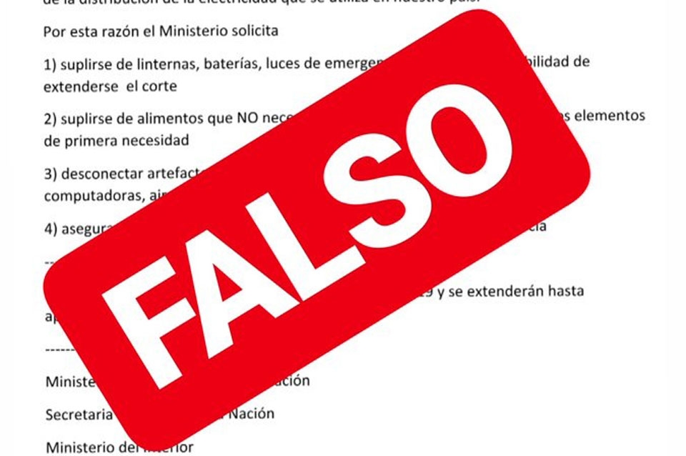 Tras el masivo apagón que sorprendió a todo el país en las primeras horas del domingo, los ciudadanos siguieron en estado de alerta. La falta de explicaciones concretas sobre los motivos de la falla que afectó también a países limítrofes hizo que, en las últimas horas, se viralice a través de Whatsapp un aviso supuestamente lanzado por organismos oficiales donde se informaba sobre un corte de luz para varias zonas del país.
