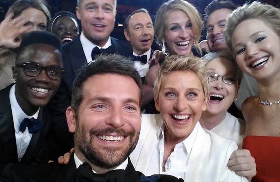La que se llevó en 2014 el premio de la major de todas, la que se le ocurrió a la encargada de dirigir la gala, Helen, la famosa conductora de television de Hellen Degeneres Show, quien se supone que había hecho algún tipo de trato con Samsung para tomar esa foto y que se hiciera famosa en twitter; esas especulaciones nacieron de que la fotografía fue tomada con un dispositivo de esa marca, pero subidas a la cuenta de la presentadora a través de un iPhone en realidad. El caso es que si batió los records.