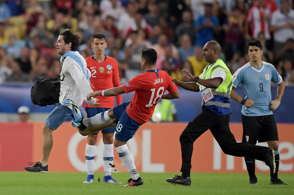 La acción, que no pudo verse por la transmisión oficial, ya que se busca no darles exposición a los intrusos, tomó por sorpresa a la mayoría, menos al uruguayo Luis Suárez, siempre atento, que enseguida le pidió al árbitro brasileño Raphael Claus la expulsión de Jara. Claro que nada de eso ocurrió.