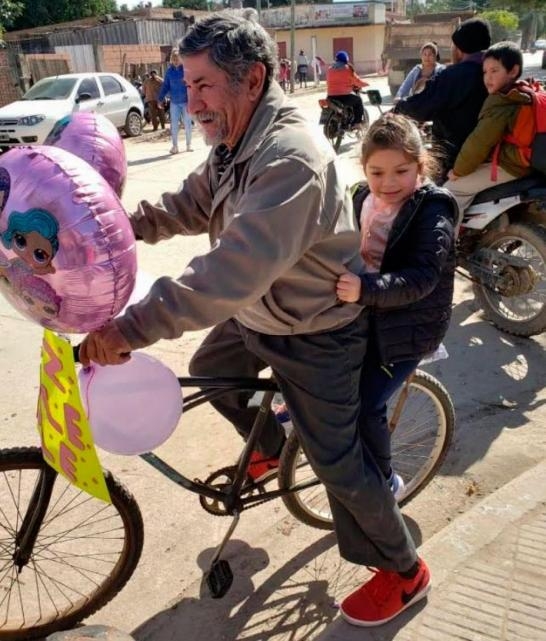 Cuando Carlos llegó, la nena se sorprendió pero feliz se subió en la sillita atrás de la bici para que su buelo la lleve de paseo. Los vecinos al ver la tierna imagen tocaron bocina y sacaron fotos que subieron a las redes sociales que se volvieron virales rapidamente.