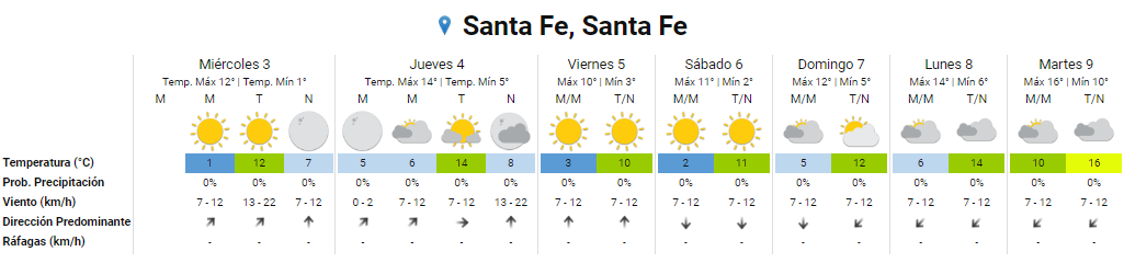 El pronóstico extendido anuncia que, por lo menos hasta el próximo martes, las máximas que alcanzarán los 16ºC, y el frío se hará sentir durante las primeras horas de cada jornada con mínimas que no superarán los 5ºC. La parte positiva de este anuncio es que no se prevén lluvias para los próximos 7 días.